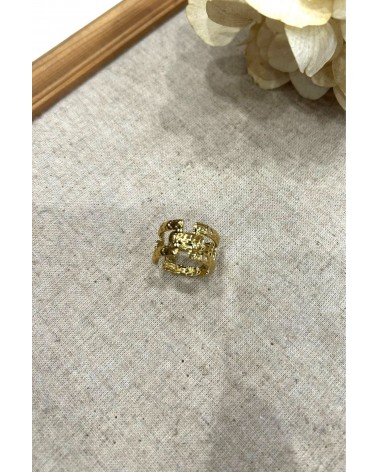 La bague Mirma se distingue par son design unique et sculptural. Plaquée en or brillant, cette bague ajustable apporte une touche de sophistication à toutes vos tenues. Parfaite pour ajouter une note audacieuse et contemporaine à votre style quotidien.