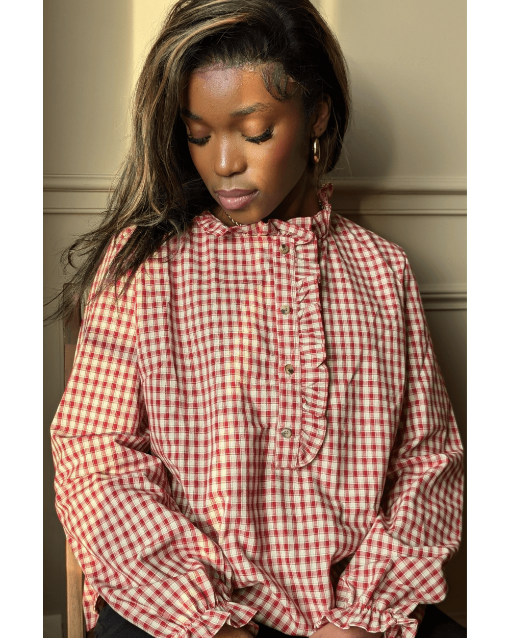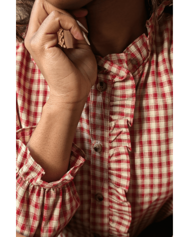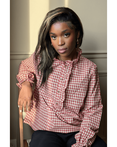 Succombez au charme intemporel de la chemise Taraine, une pièce au style vintage et féminin inspirée de l’élégance champêtre. Son motif à carreaux bordeaux et écru, combiné à son col volanté délicat et sa patte de boutonnage ornée de volants, confère à cette chemise une allure à la fois romantique et authentique. Polyvalente et élégante, la chemise Taraine se porte aussi bien rentrée dans un jean pour un look casual chic, que sous un gilet en maille ou un pull sans manches pour un style plus bohème et automnal. N'attendez plus, louez-la !