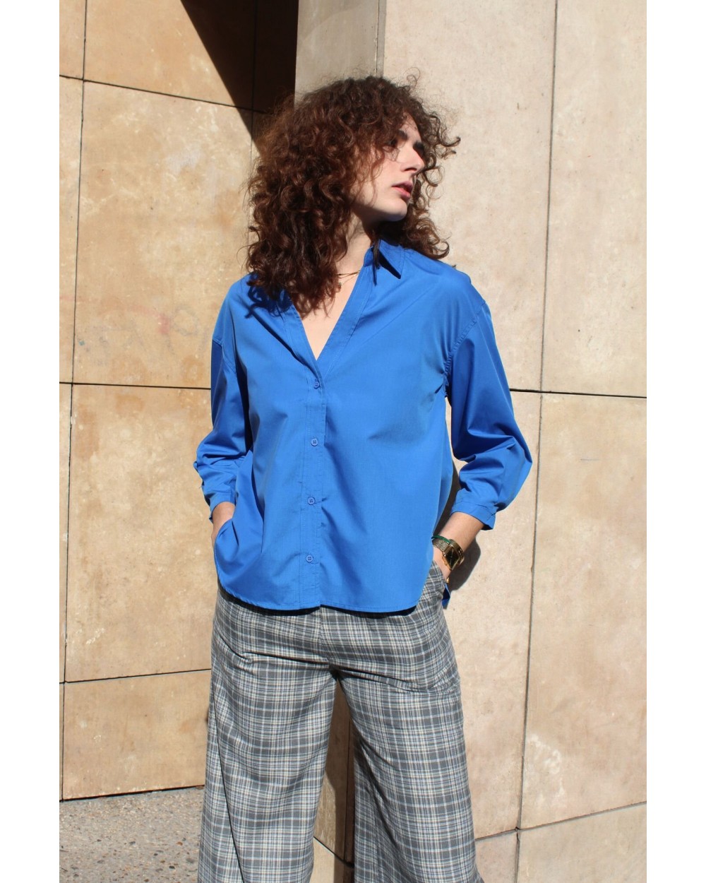 Manon mesure 1m76 et porte une taille S. Naturellement oversize, cette chemise taille légèrement plus grande.