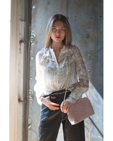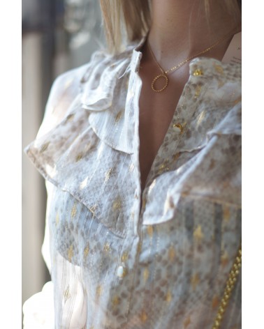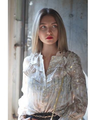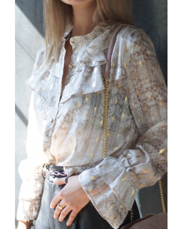 Le chemisier Mendy avec ses volants et ses motifs brillants est la pièce parfaite pour être chic et élégante en toute circonstance.