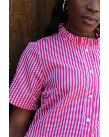 Avec sa teinte rose presque fluo et ses rayures ton sur ton, elle apporte un vrai shot d’énergie et de style. Sa coupe courte et structurée met en valeur les jambes, tandis que les petits froufrous au niveau du col ajoutent une touche fun et féminine. Pratique et stylée, elle est dotée de poches sur les côtés — le détail qu’on adore pour allier confort et fonctionnalité.