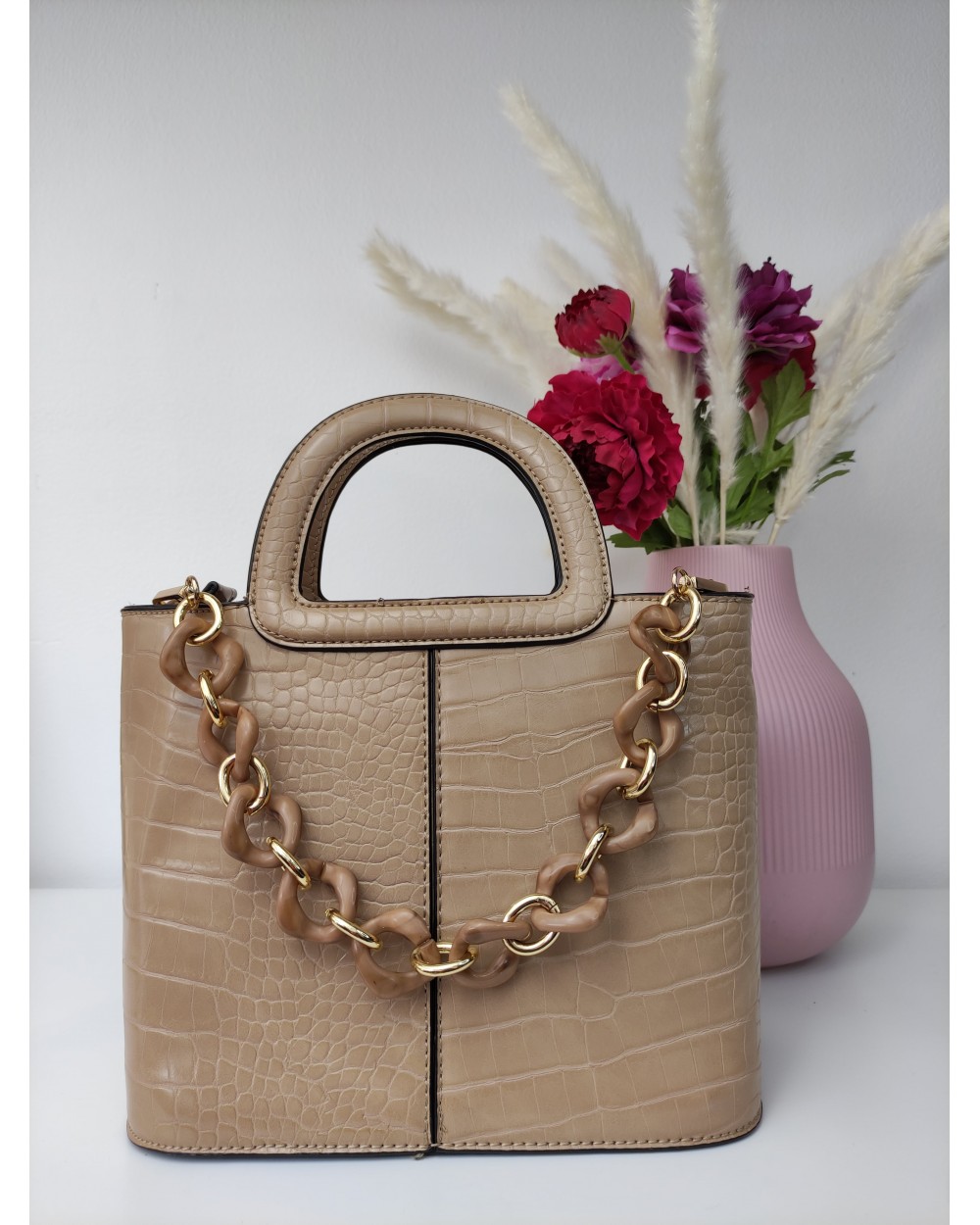 • Deuxième anse chaîne bi-matière : plastique et métal doré.