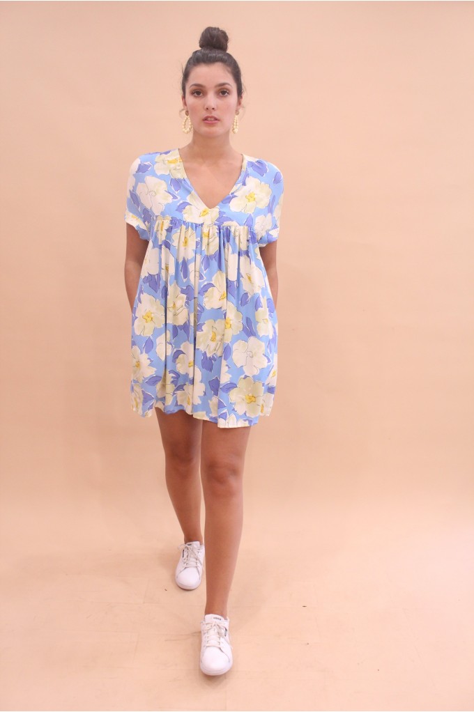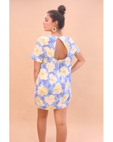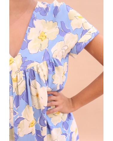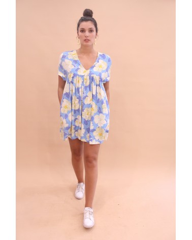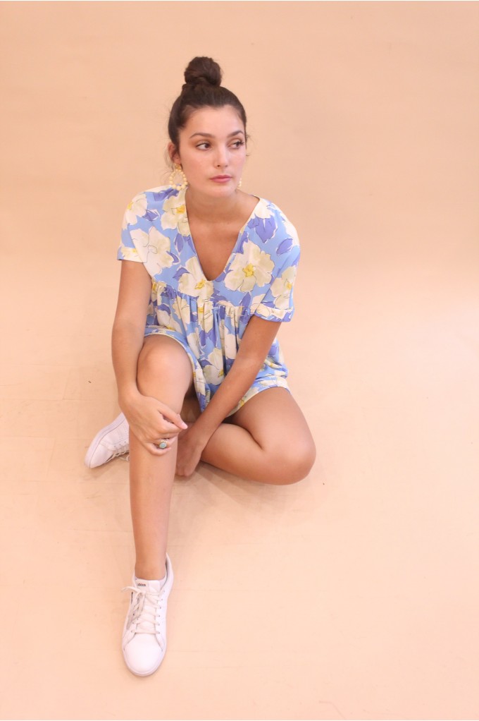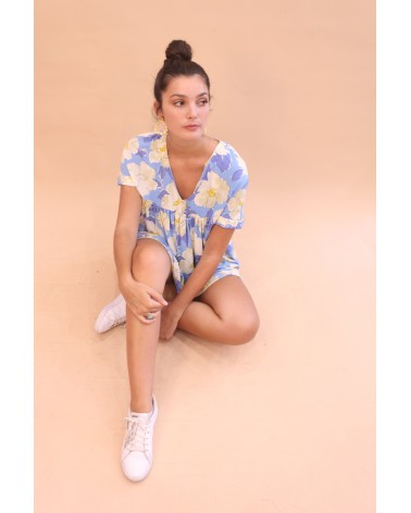 Cette combinaison short courte fleurie est très féminine et s’adapte à chaque occasion. Son aspect robe, avec un short en dessous, la rend très pratique.