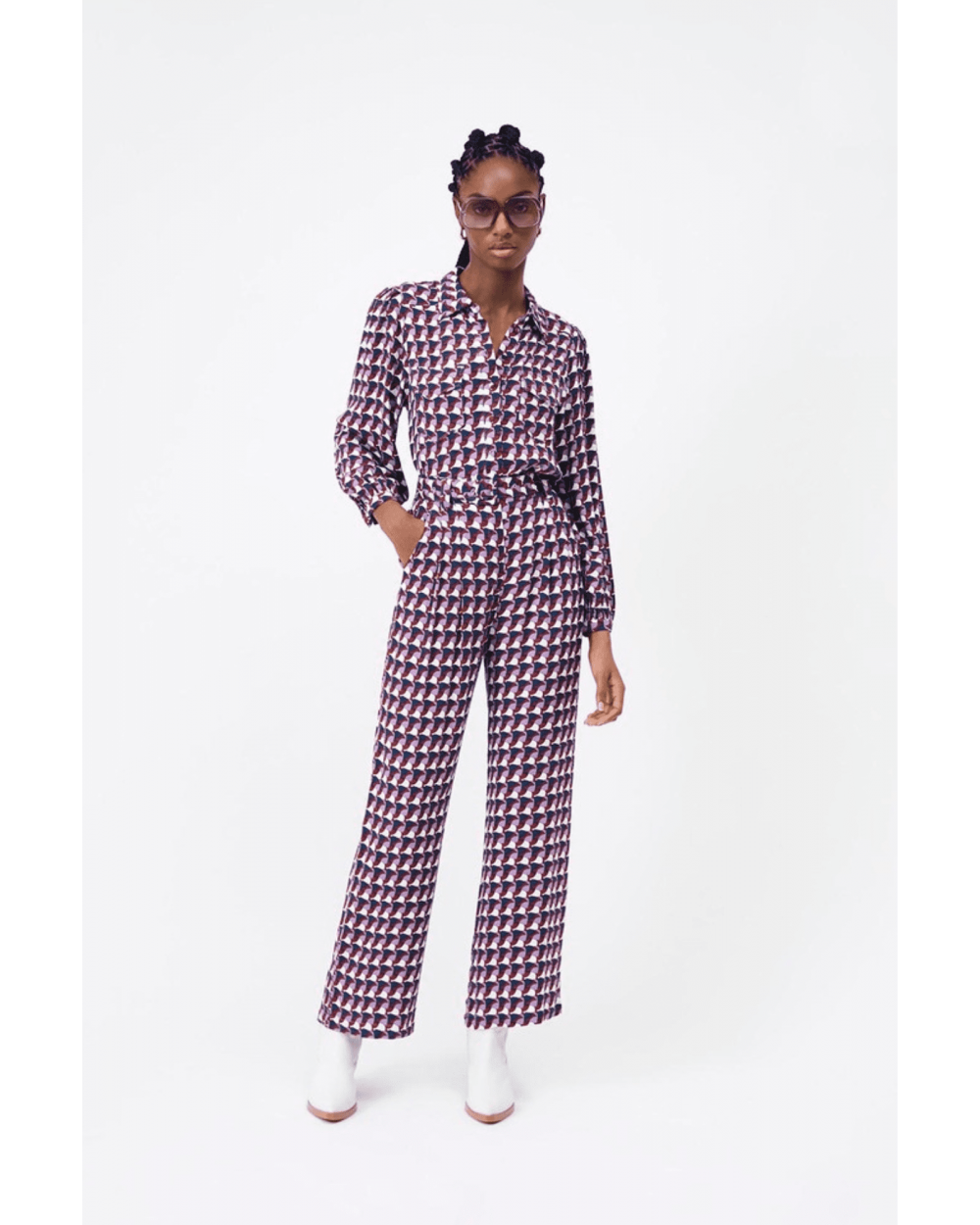 Le pantalon John est lest fluide à imprimé vintage géométrique. Il s'accorde avec tout, louez-le !