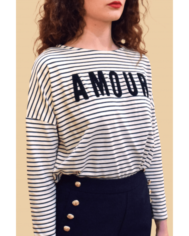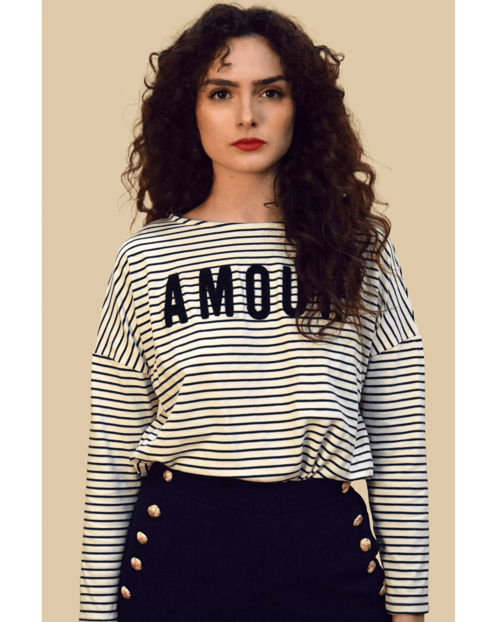 Le T-Shirt Romain est un t-shirt rayé blanc et vert à col rond et à manches longues. Ce T-Shirt floqué amour est un basique revisité pour votre garde robe ! À louer absolument !