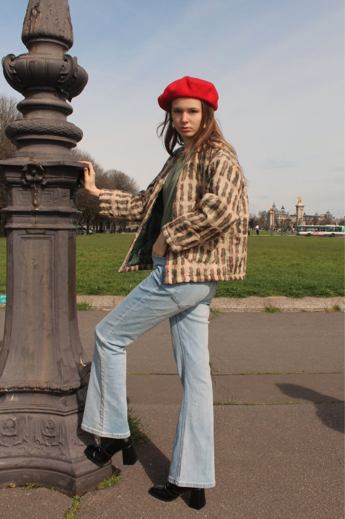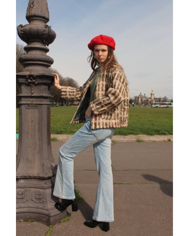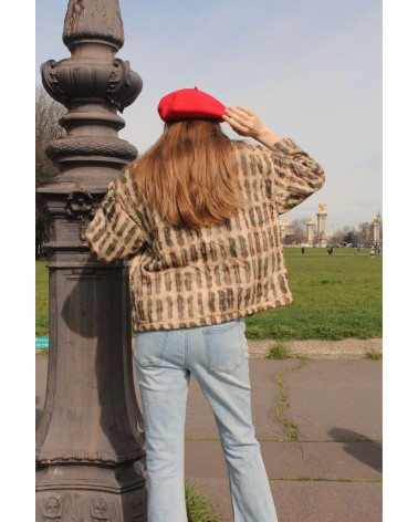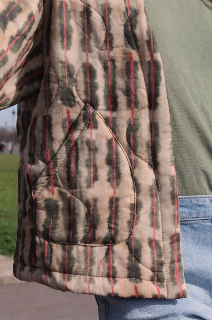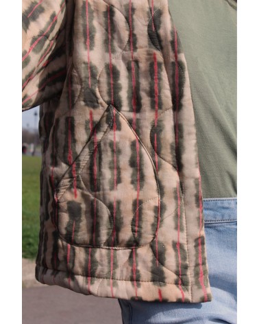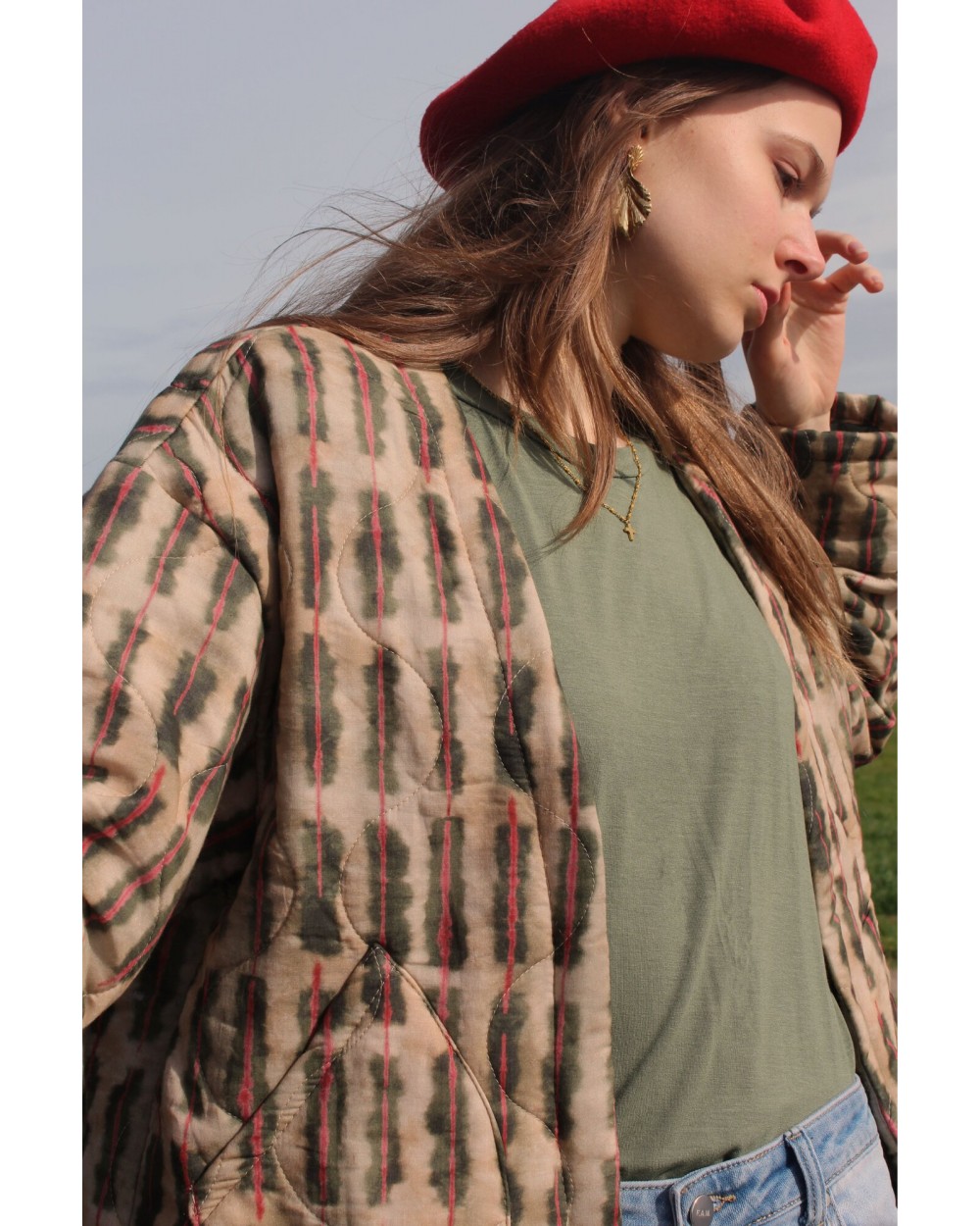 La veste Nina est une veste matelassée verte et rose, ouverte sur le devant. Essayez-la, louez-la !