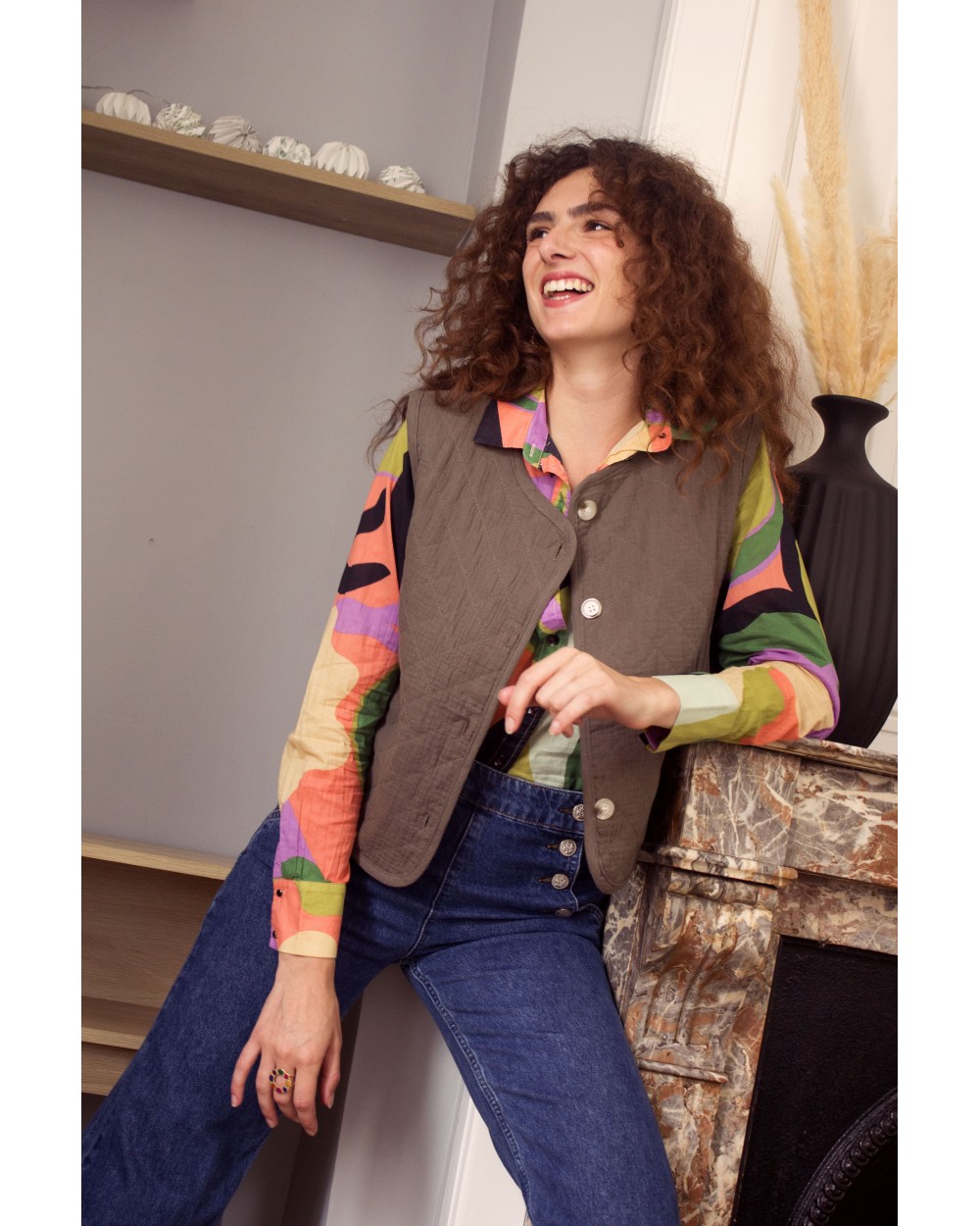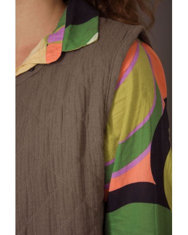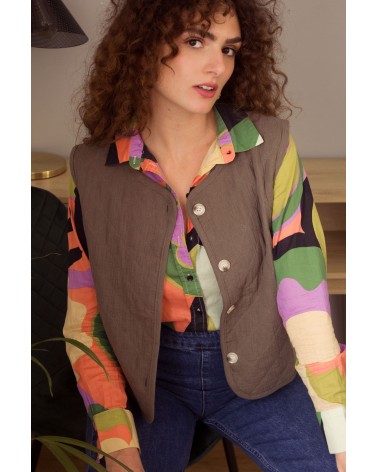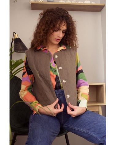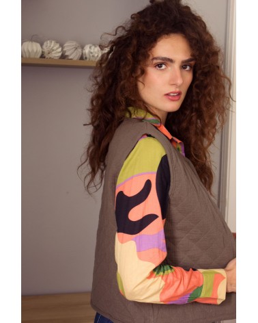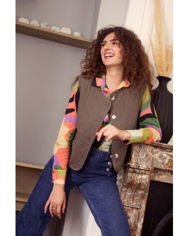 La veste Laonie kaki est un gilet matelassé sans manches avec encolure ronde, un liseré uni devant et des boutons. Louez-le toute l'année !