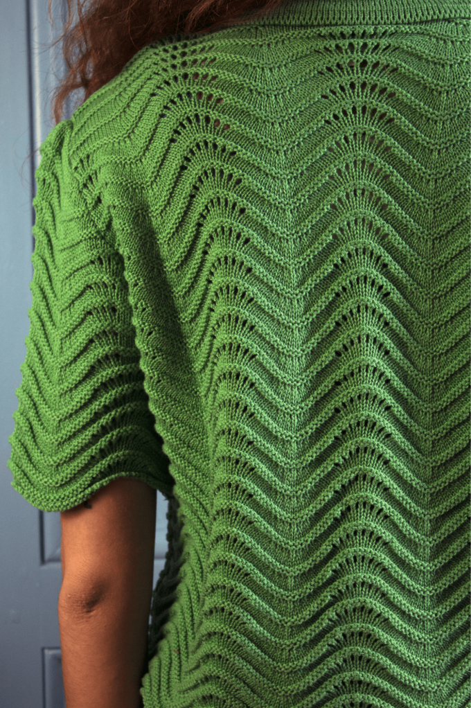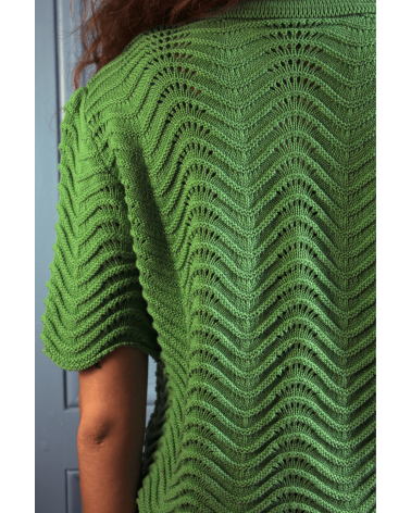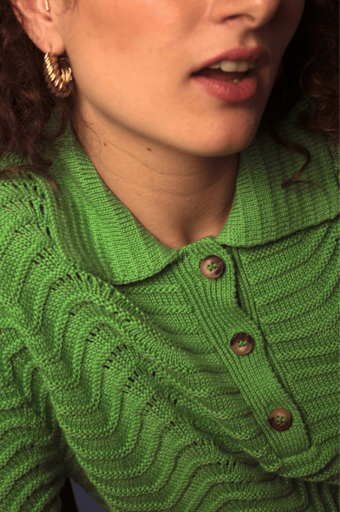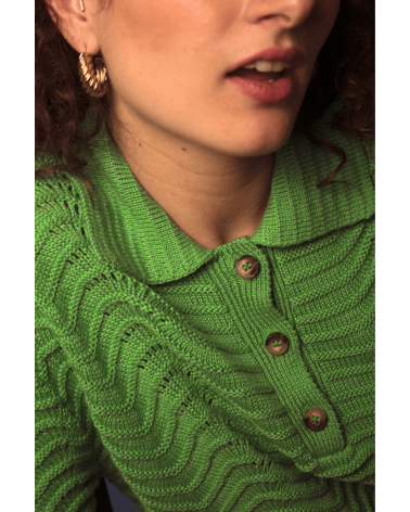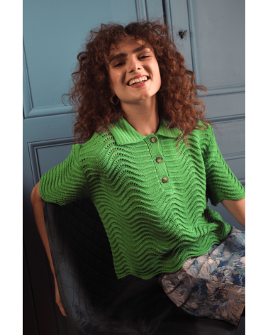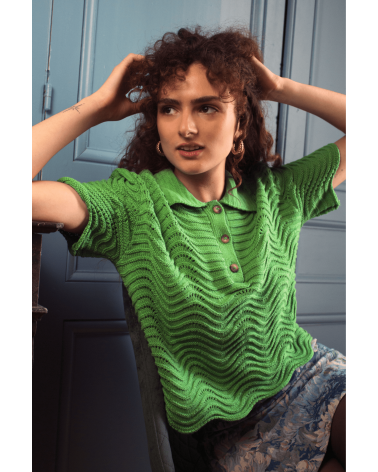Volcy est un pull avec des manches courtes et un col à revers lui donnent son look rétro. Son motif tricot en forme de vagues est le détail qui fait tout ! À louer absolument !