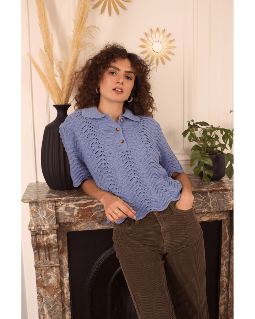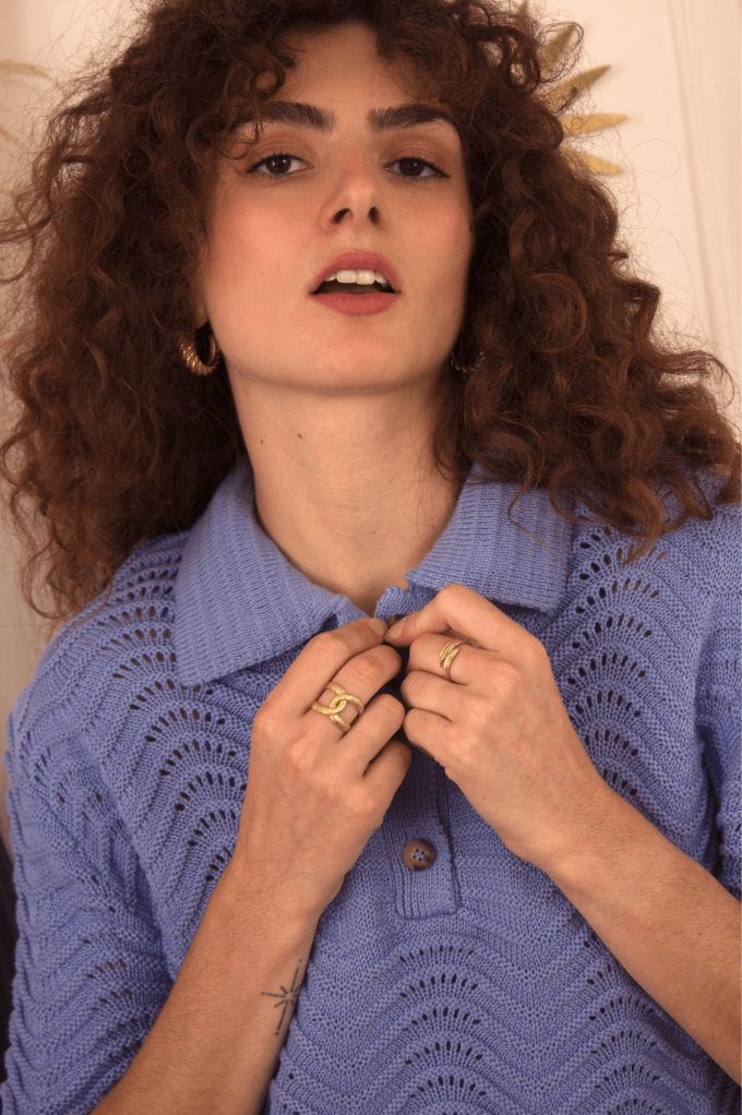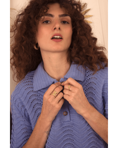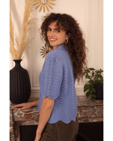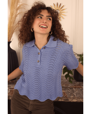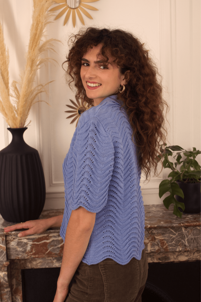 Volcy est un pull avec des manches courtes et un col à revers lui donnent son look rétro. Son motif tricot en forme de vagues est le détail qui fait tout ! À louer absolument !