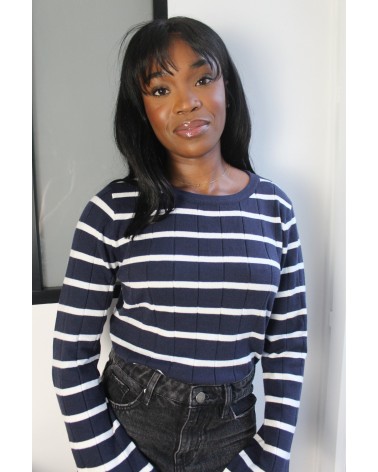 Découvrez le pull Noubia, c'est un pull à rayures marines. Il allie élégance classique et modernité. Avec ses manches évasées et son col rond, il offre un style à la fois chic et décontracté. Confortable et facile à porter, c’est la pièce idéale pour un look casual tout en restant sophistiqué. N'attendez plus, louez-le !