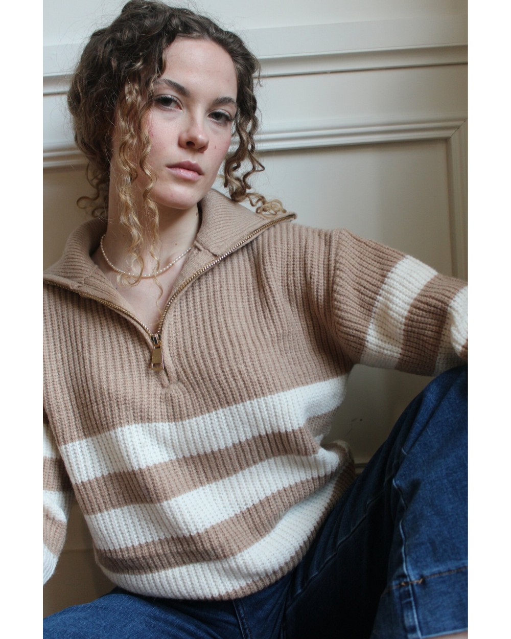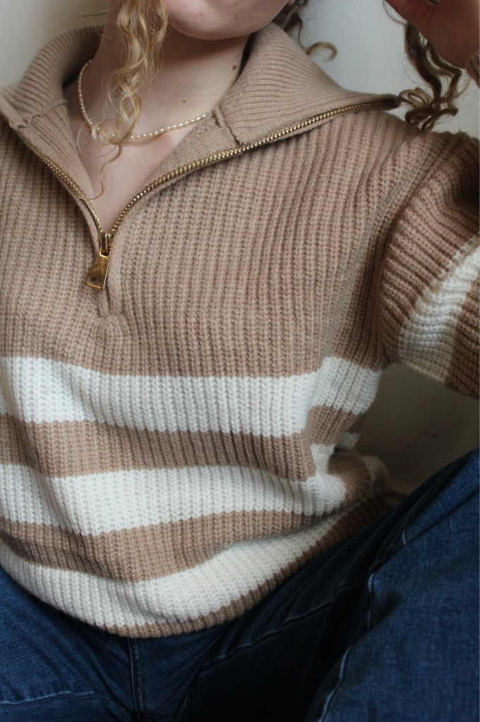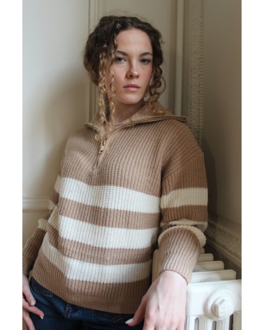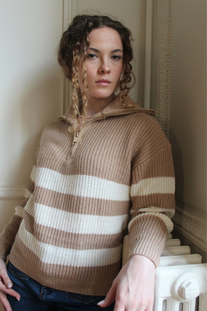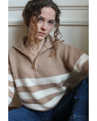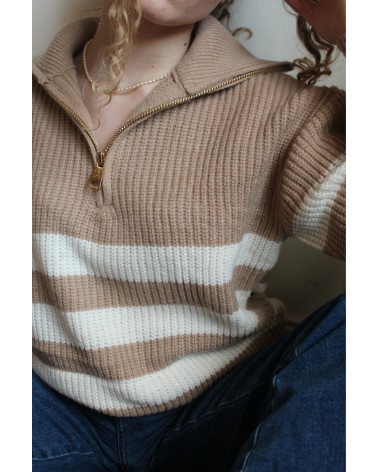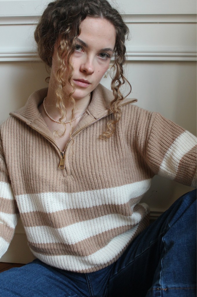 Le Pull Pamella, est un incontournable de la saison grâce à sa maille chaude et son col haut. Son plus, la fermeture à glissière de couleur or qui apporte la touche finale. À louer pour vos looks d'hiver !