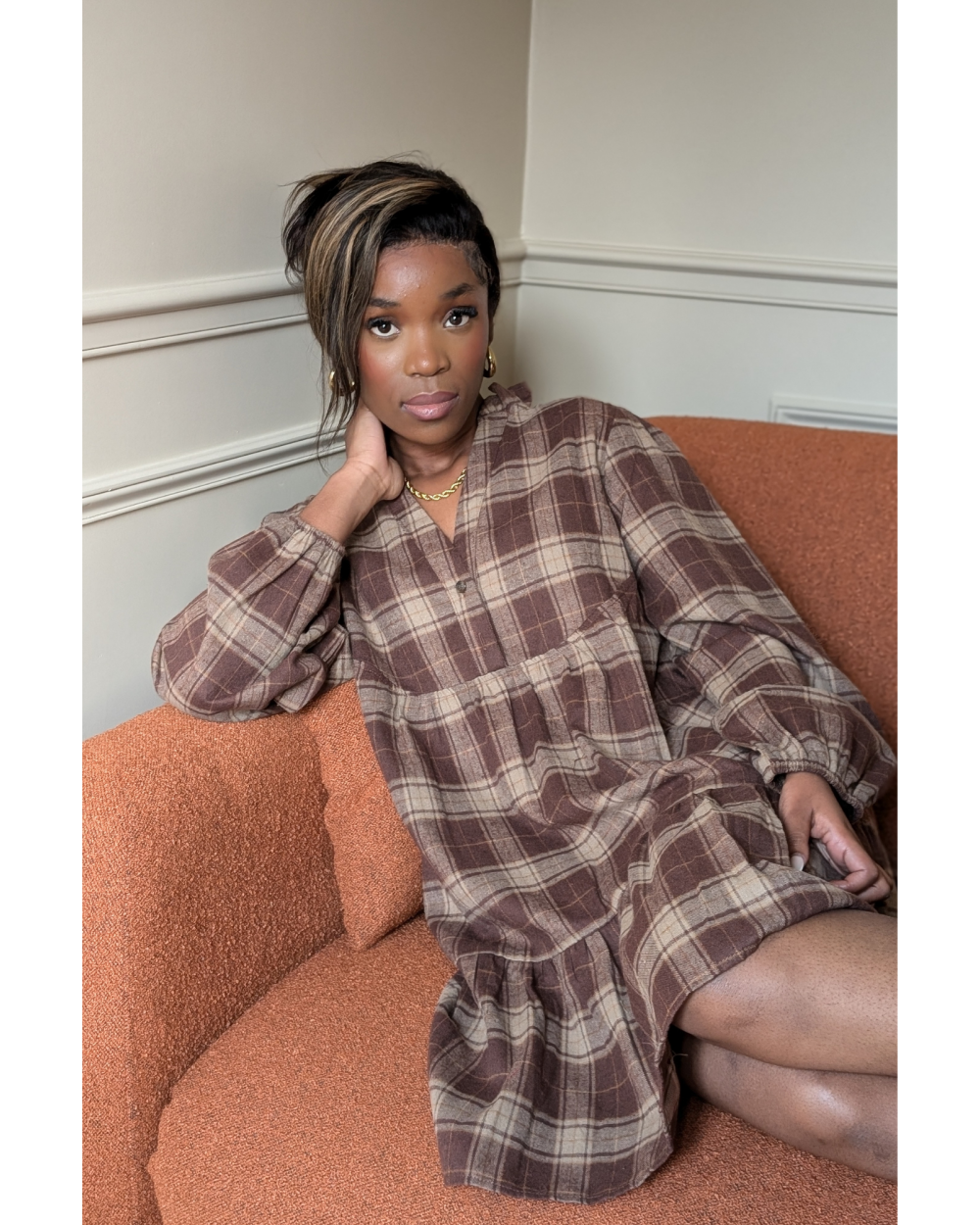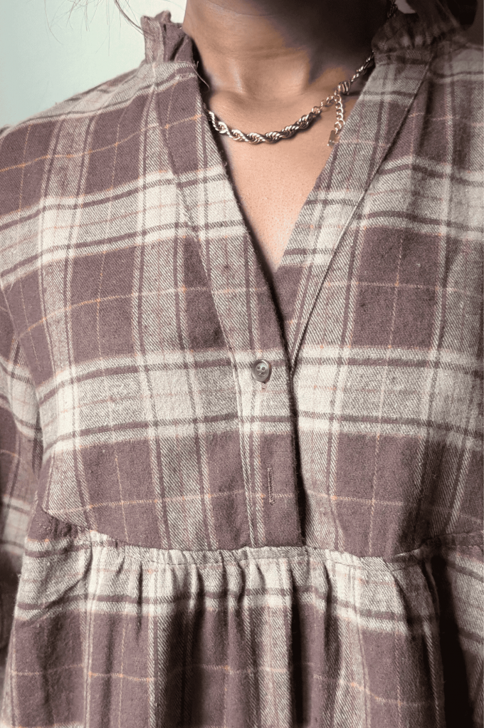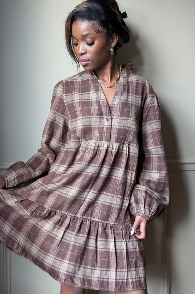 Laissez-vous séduire par la robe Tulipe, une pièce qui allie confort, douceur et féminité. Avec son motif à carreaux marron et beige, cette robe courte à la coupe fluide s’impose comme un incontournable de la saison automne-hiver. La robe Tulipe se distingue par sa forme légèrement évasée et sa basque froncée qui apporte du mouvement et une touche romantique. Son col V délicat et ses manches longues en font une pièce idéale pour un look à la fois décontracté et raffiné. Portez-la avec une paire de bottines pour un style automnal plein de charme, ou avec des baskets pour un look plus moderne et casual. Allez hop dans la box.