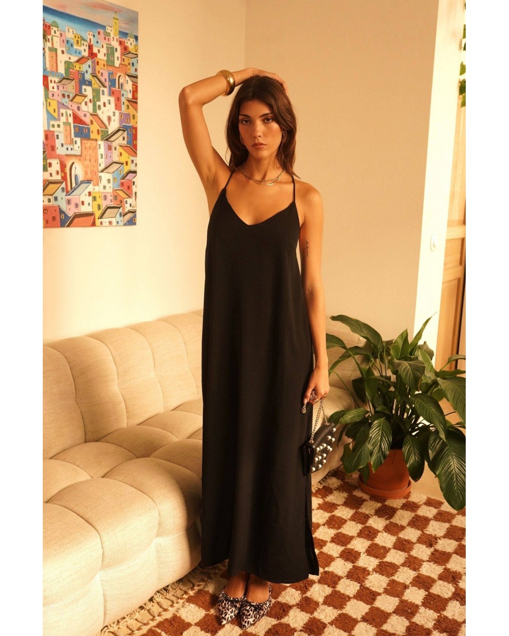 Robe longue noire à bretelles, elle incarne la simplicité chic qu’on adore. Avec sa coupe fluide et basique, elle épouse les mouvements tout en allongeant la silhouette. Intemporelle et passe-partout, elle s’adapte à toutes les occasions : soirée, cérémonie, dîner en ville ou moment décontracté en sandales.