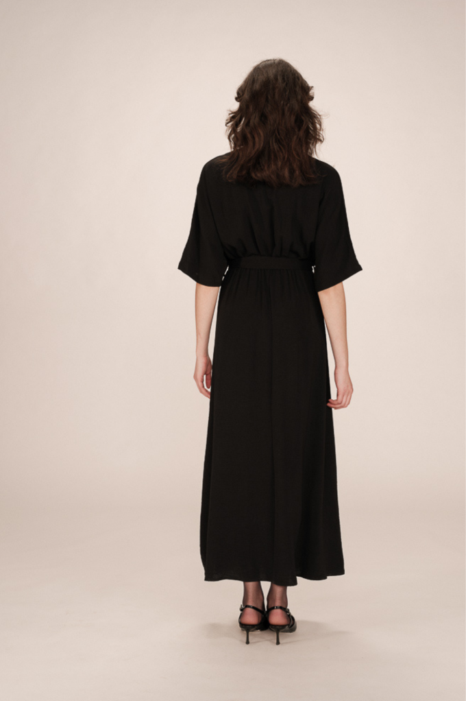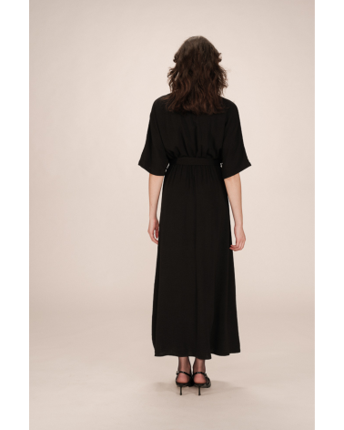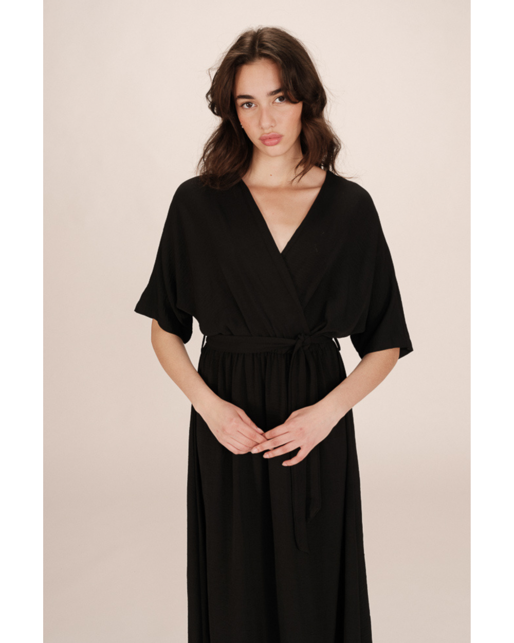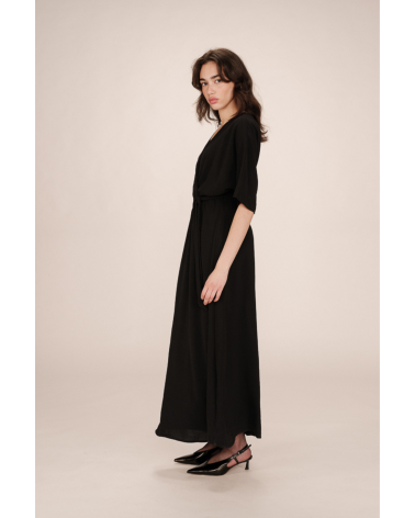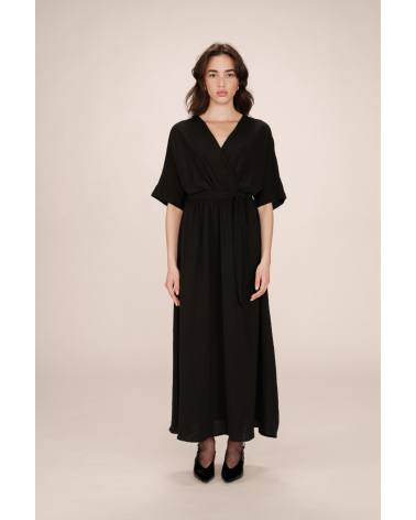Une coupe portefeuille intemporelle ! La robe Maud sublime la silhouette avec son col croisé, ses manches larges et sa taille ceinturée. Fluide, longue et noire, elle coche toutes les cases de l’élégance minimaliste. À porter avec des talons ou des baskets. Allez hop dans la box !