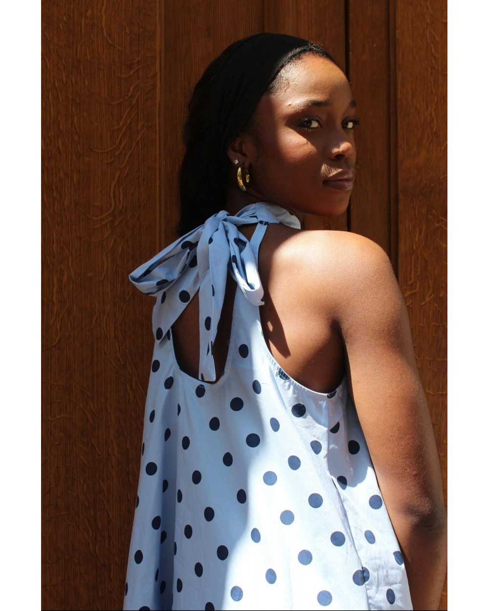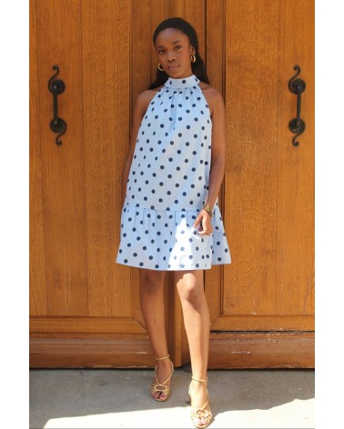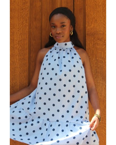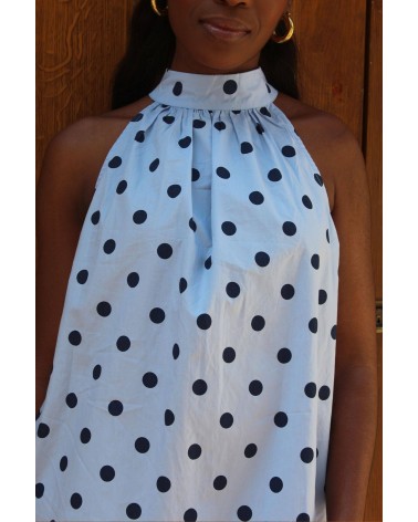 Dans un bleu doux, elle est rehaussée par des pois bleu foncé qui lui donnent un look rétro chic. Son atout charme ? Un gros nœud noué au niveau du cou, qui apporte une touche féminine et sophistiquée. Sa coupe courte et fluide offre légèreté et confort pour toutes vos occasions estivales.