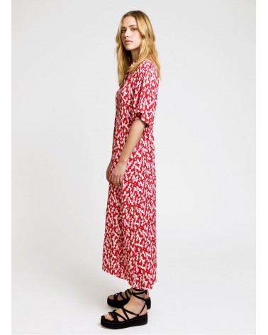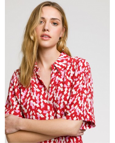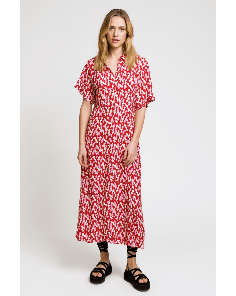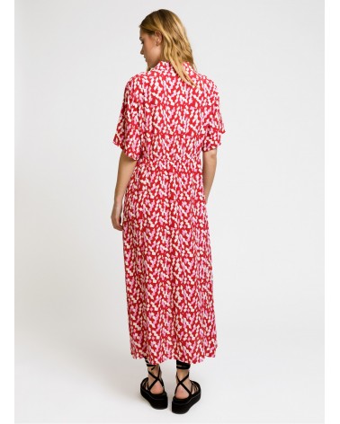 Robe chemise midi Moby est une robe fluide rose et rouge parfaite pour l'été, louez-la !
