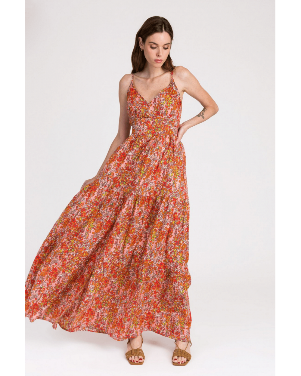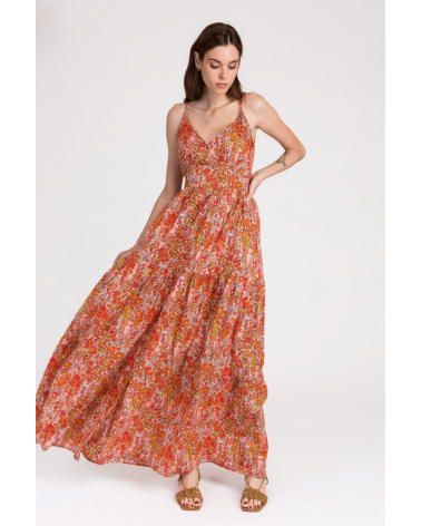 La robe Ogathe à bretelle est la robe orange et rose à motifs fleuris glamour par excellence. On aime sa coupe bohème et fluide idéale pour cet été !