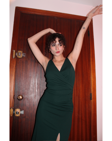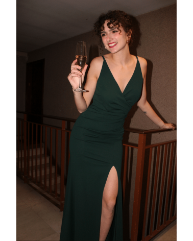 La robe Johanne verte est parfaite pour les fêtes. Sa matière fluide et élastique épousera votre silhouette, louez-la !