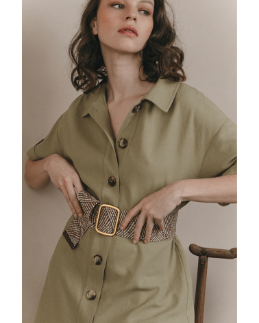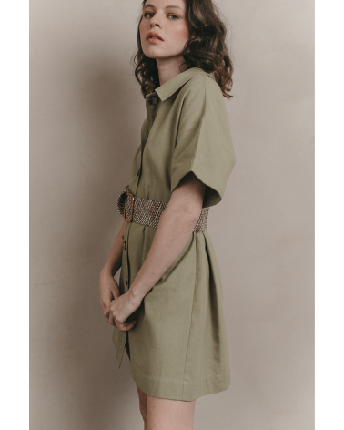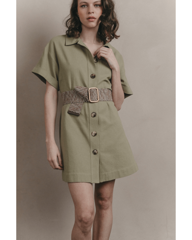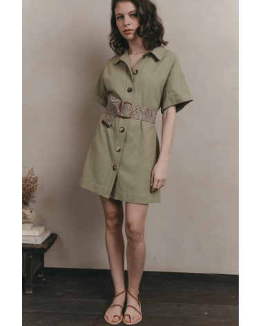 Johanne est une robe courte boutonnée sur le devant avec une ceinture de tissu à nouer sur le devant. On aime la coupe de cette robe avec ses épaules tombantes, ses manches larges à revers, et son tissu épais en 100% coton, qui offrent une allure casual, naturelle et tout en confort. La silhouette est mode et décontractée avec un style aventurière qu’on adore !