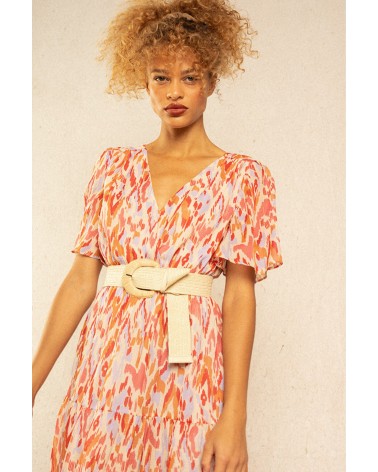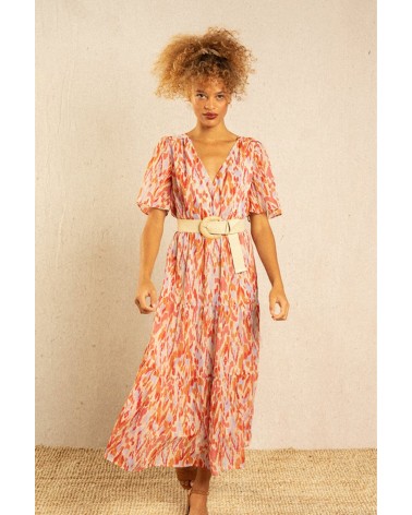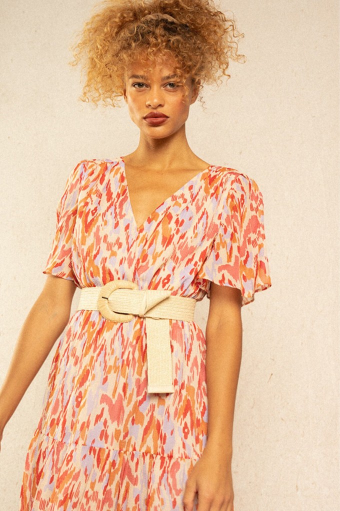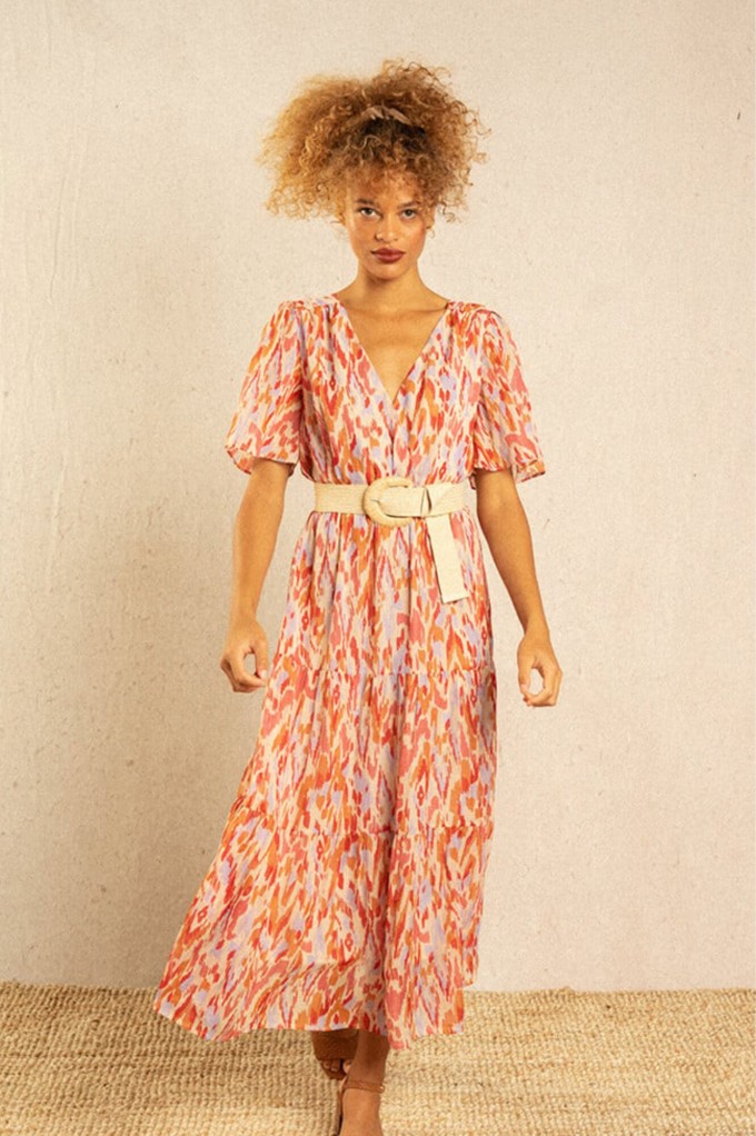 La robe Inca est une robe maxi colorée et bohème resserrée à la taille. Fraîche et pimpante on adore son imprimé tacheté ! Louez-la !