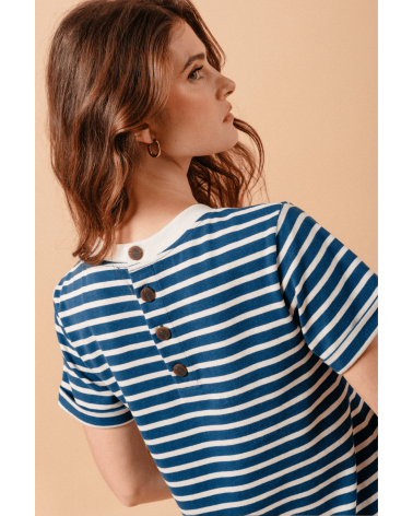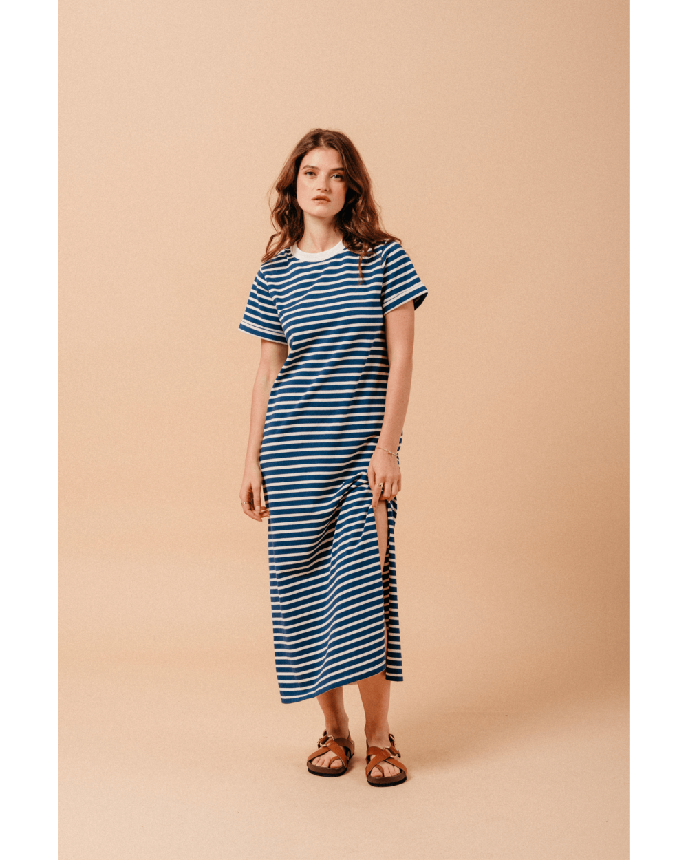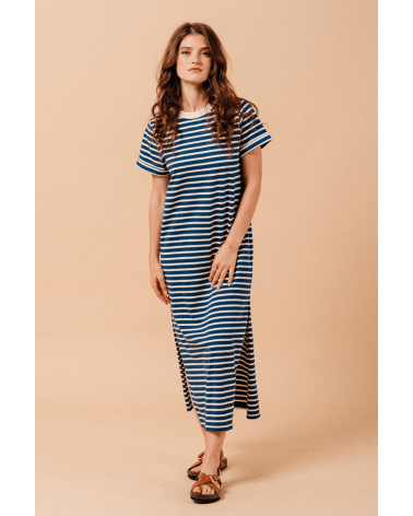 Montmartre est une robe longue imprimée style marinière en jersey. Sa coupe droite et son encolure ronde sublimerons les courbes de chaque femme. On adore son style décontracté et ses fentes sur les côtés qui laissent place aux mouvements.  Louez-la !