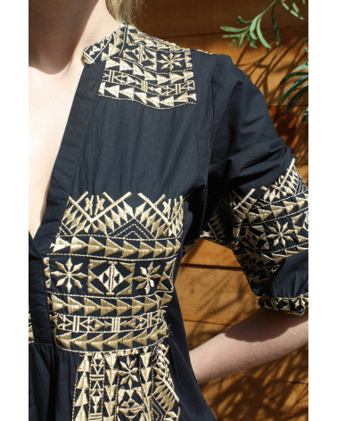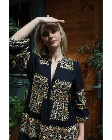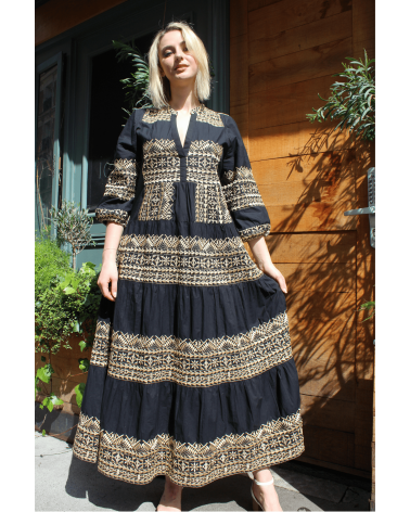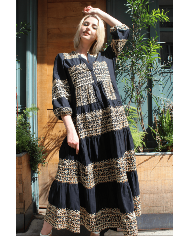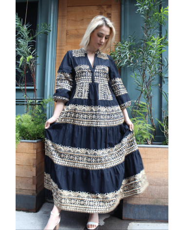 La robe Nae, d'inspiration orientale est une robe longue ornée d'un imprimé graphique qu'on adore ! On aime l'associer avec des sandales à talons pour un effet bohème. Allez hop, dans la box !
