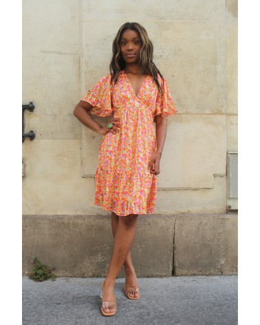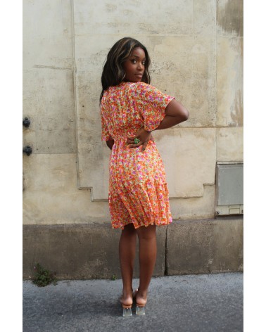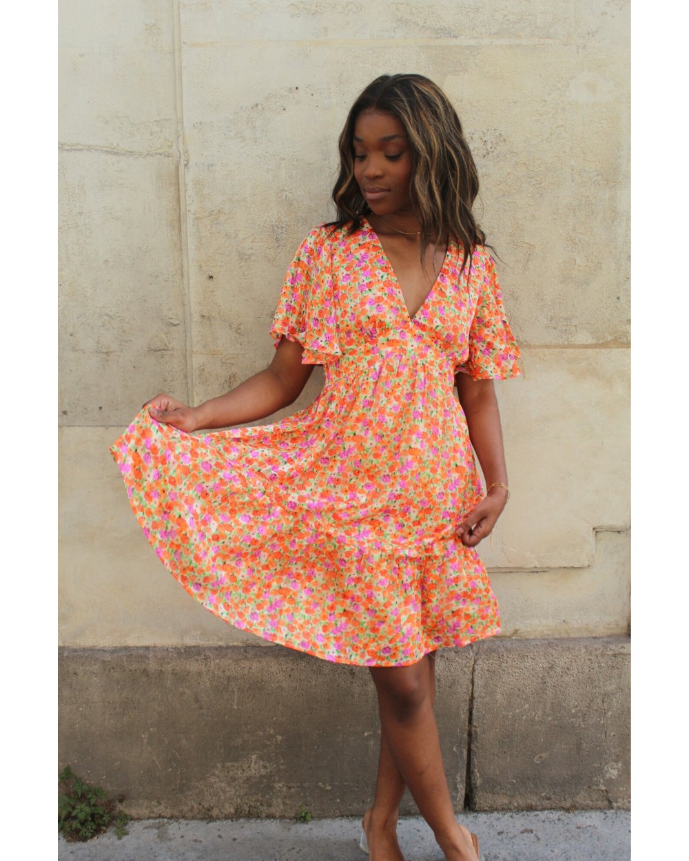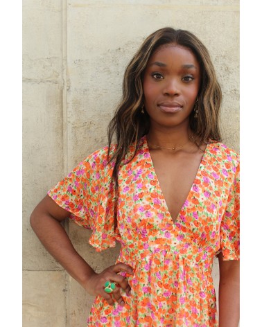 Fraîche, joyeuse et fluide, la robe Ondine est un hymne à l’été. Son imprimé fleuri multicolore sur fond orangé illumine la silhouette, tandis que sa coupe empire et ses manches papillon apportent une allure bohème irrésistible. Conçue pour virevolter au rythme de vos journées ensoleillées, elle se porte aussi bien en terrasse qu’en escapade à la campagne.