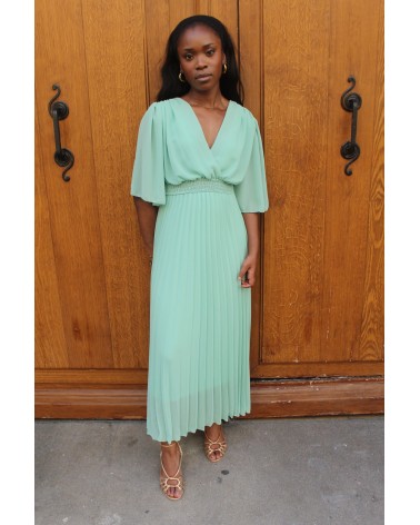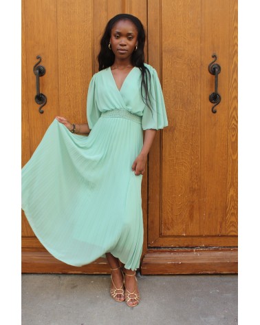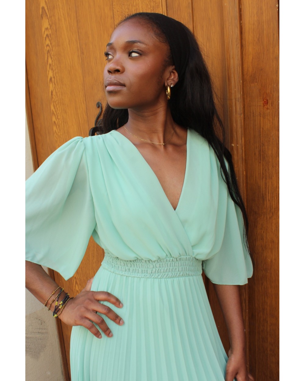 Cette robe longue vert d'eau est une pièce légère et élégante, dotée d’une jupe plissée qui danse au moindre mouvement.