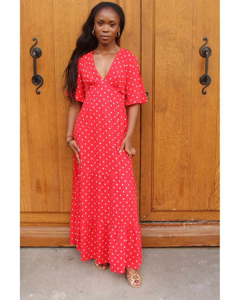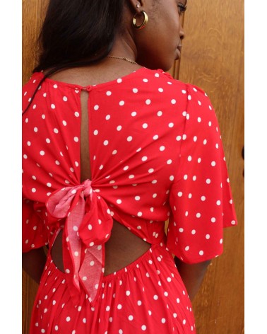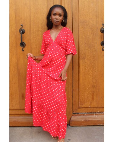 La robe Petits Pois séduit par son imprimé à pois rouges et sa coupe longue et cintrée. Légère et fluide, elle dévoile un décolleté subtil et une finition volantée en bas de jupe. Un modèle féminin et intemporel, à porter aussi bien en journée qu’en soirée.