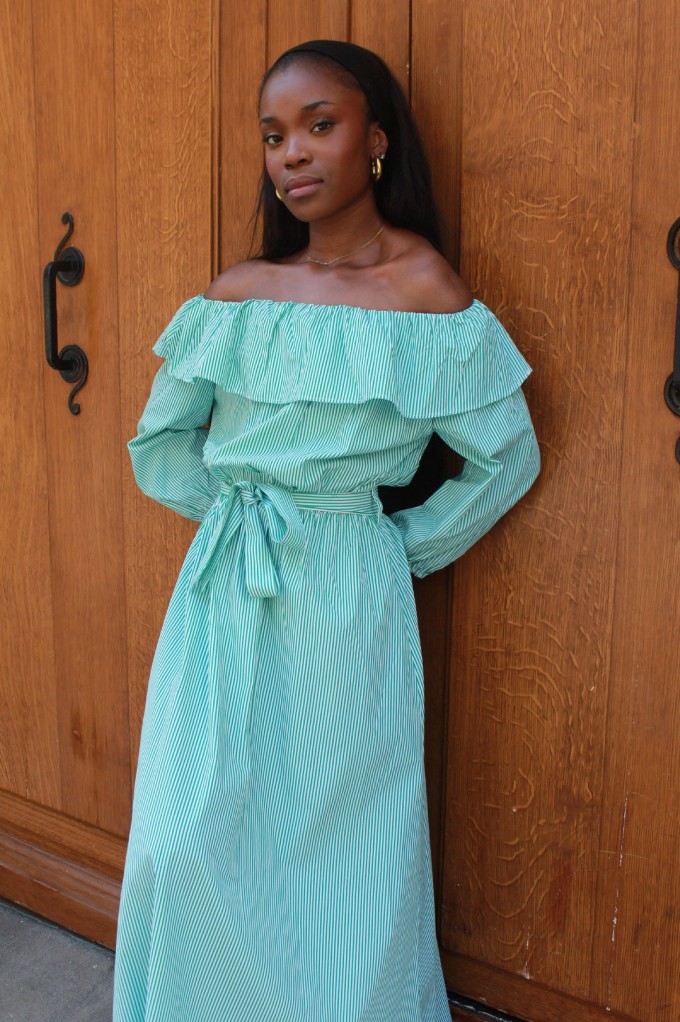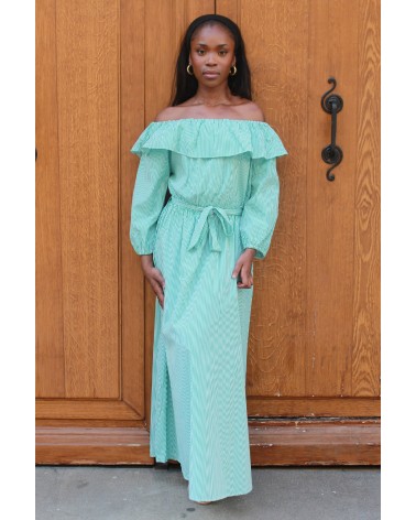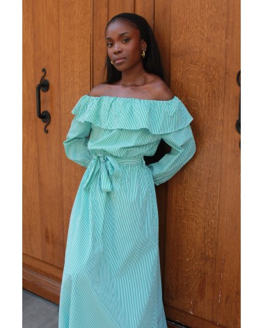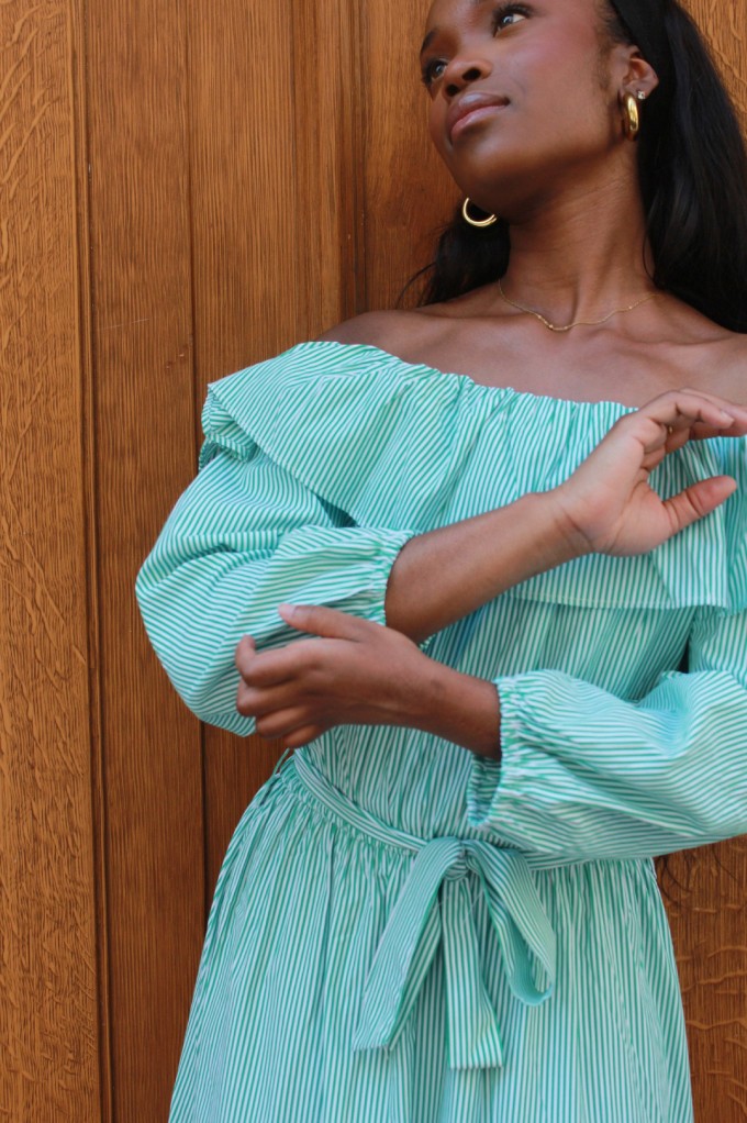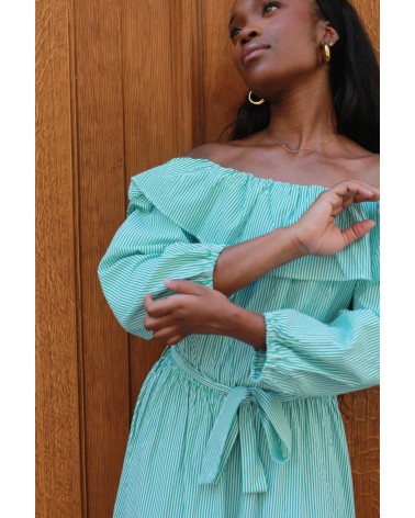 La robe Lilo est une véritable pépite estivale ! Avec ses rayures vert et blanc, son col bateau délicat et ses jolis volants, elle respire la fraîcheur et la féminité. Sa coupe fluide et sa ceinture à la taille viennent souligner la silhouette tout en offrant un confort optimal. À la fois légère et élégante, c’est la robe parfaite pour vos journées ensoleillées, vos garden-parties ou un week-end à la mer.