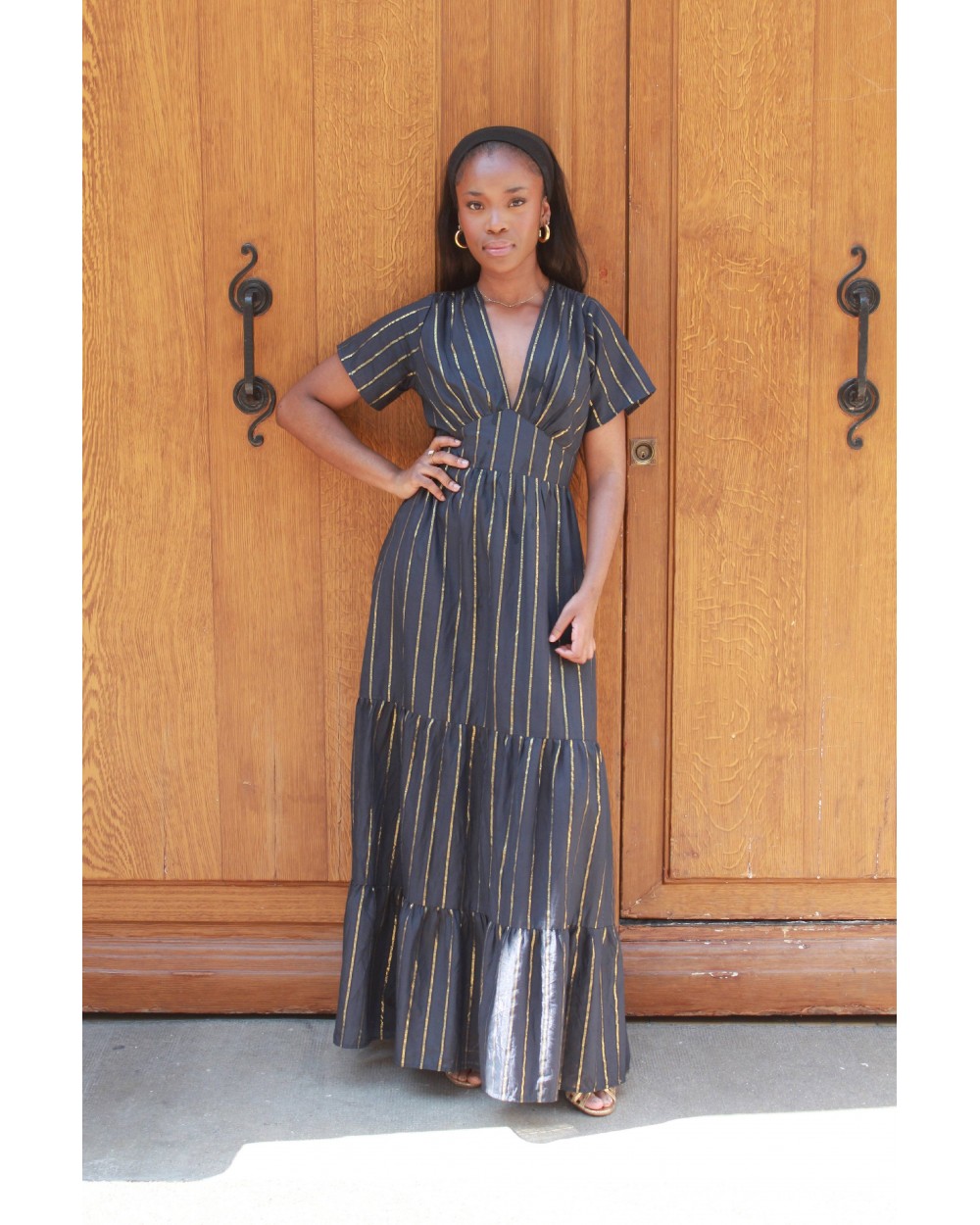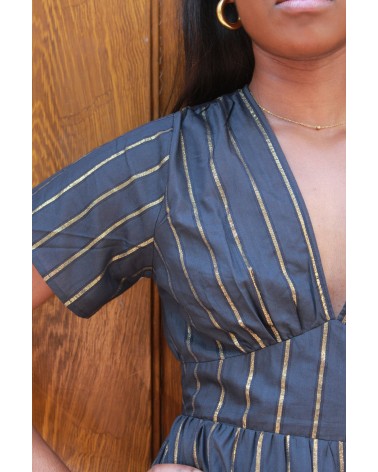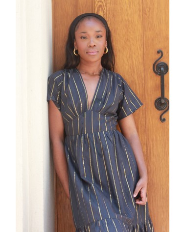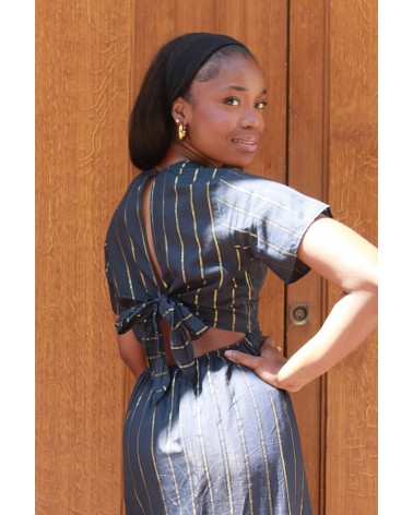 Découvrez la robe Papillon, une pièce élégante et lumineuse qui allie sophistication et originalité. Sa couleur bleu profond sublimée par des traits brillants dorés apporte une touche chic et festive à votre tenue. Le dos noué ajoute un détail raffiné et féminin, parfait pour mettre en valeur votre silhouette avec charme.