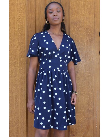 Découvrez la robe Soulia, une robe courte et fluide qui allie charme et fraîcheur estivale. Son bleu profond parsemé de pois blancs apporte une touche rétro et élégante, tandis que ses volants délicats soulignent la féminité de cette pièce légère. Conçue pour offrir confort et style, la robe Soulia est parfaite pour vos sorties en journée comme en soirée.