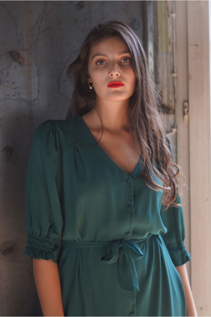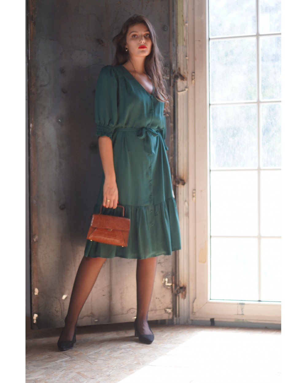 Cette robe ample et évasée est parfaite pour une grande occasion comme un mariage ou une soirée avec des talons ou pour un look casual avec une paire de baskets. Son décolleté et ses volants la rendent très féminine et singulière.