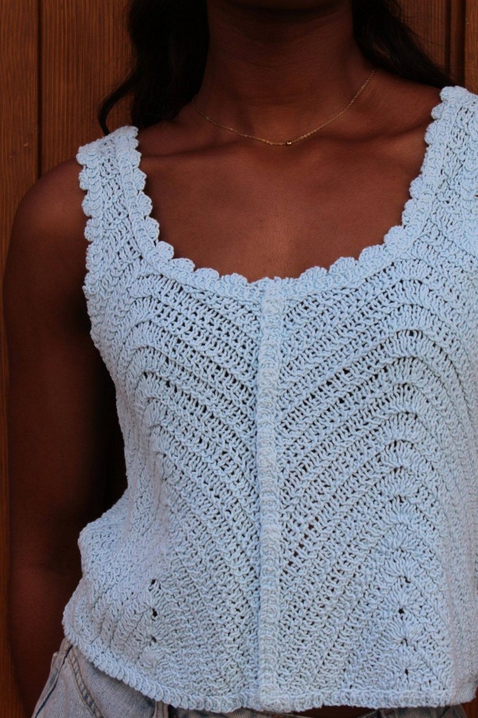 Dans un bleu profond, ce top tressé séduit par son allure originale et ses fines bretelles qui mettent la silhouette en valeur. Sa coupe courte en fait une pièce idéale pour les journées chaudes d’été ou pour compléter une tenue tendance et décontractée.