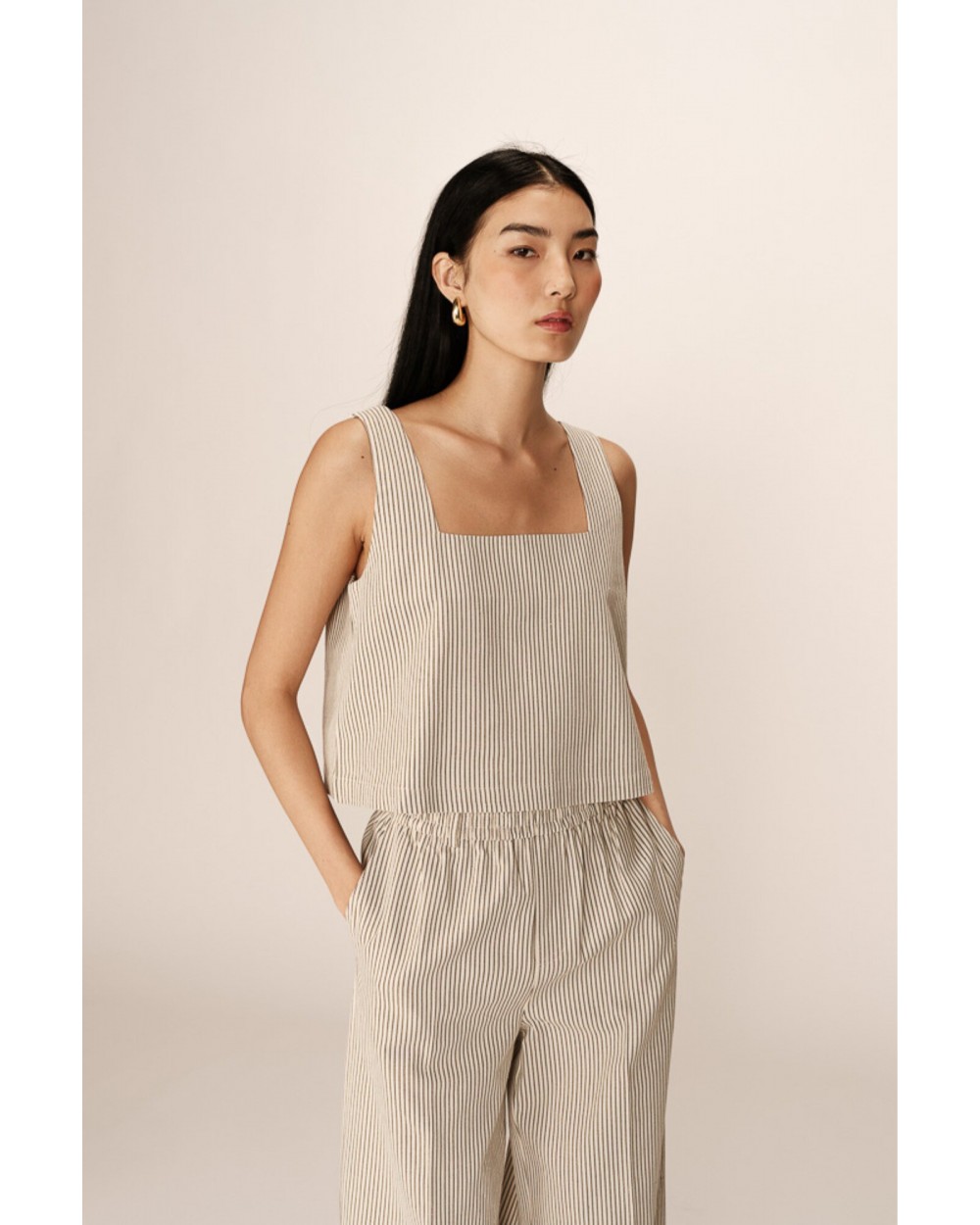 Le top PEANUT mise sur une simplicité moderne avec ses lignes épurées et son tissu à rayures en fibres naturelles. Sa coupe droite et sa longueur courte offrent une silhouette nette et actuelle. Sans manches, avec une encolure carrée et une ouverture boutonnée dans le dos, il est aussi pratique qu’élégant.