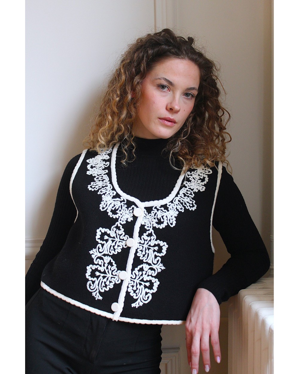 Gwendoline porte une taille S. Le gilet taille normalement, optez pour votre taille habituelle.
