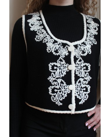 Ajoutez une touche de sophistication à votre tenue avec notre Gilet Pepy à manches courtes, magnifiquement orné de broderies blanches délicates.