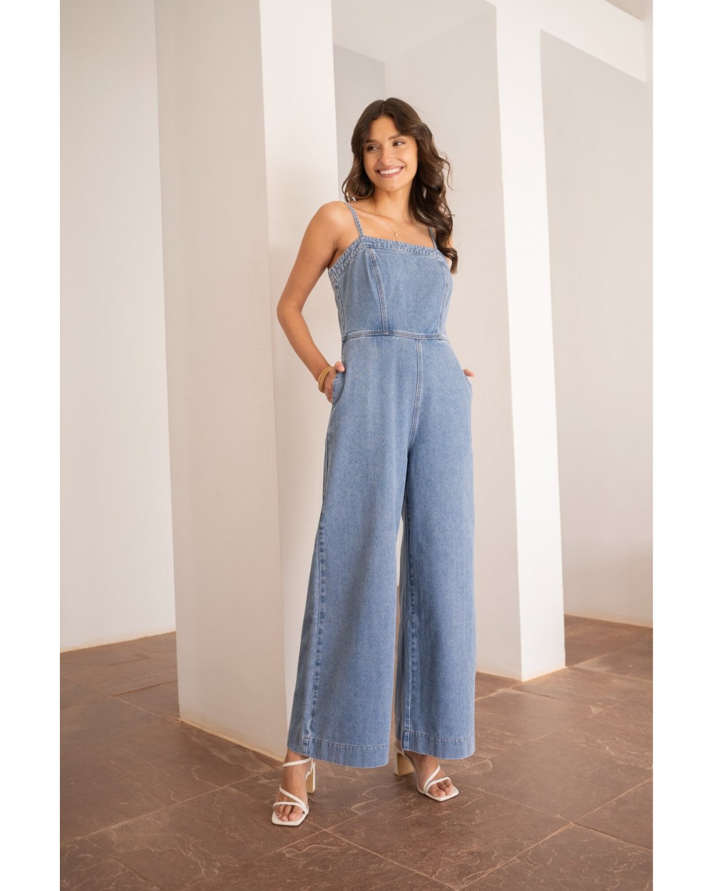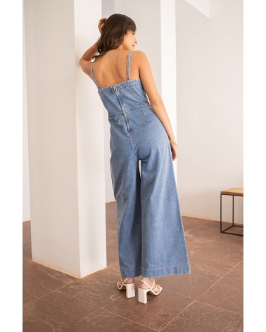 La combinaison Nova revisite le denim avec une coupe épurée et moderne. Sa taille marquée, son haut ajusté à fines bretelles et ses jambes larges créent une silhouette flatteuse et féminine sans effort. Confortable et stylée, elle se porte aussi bien avec des talons pour une soirée que des baskets pour un look casual de journée.